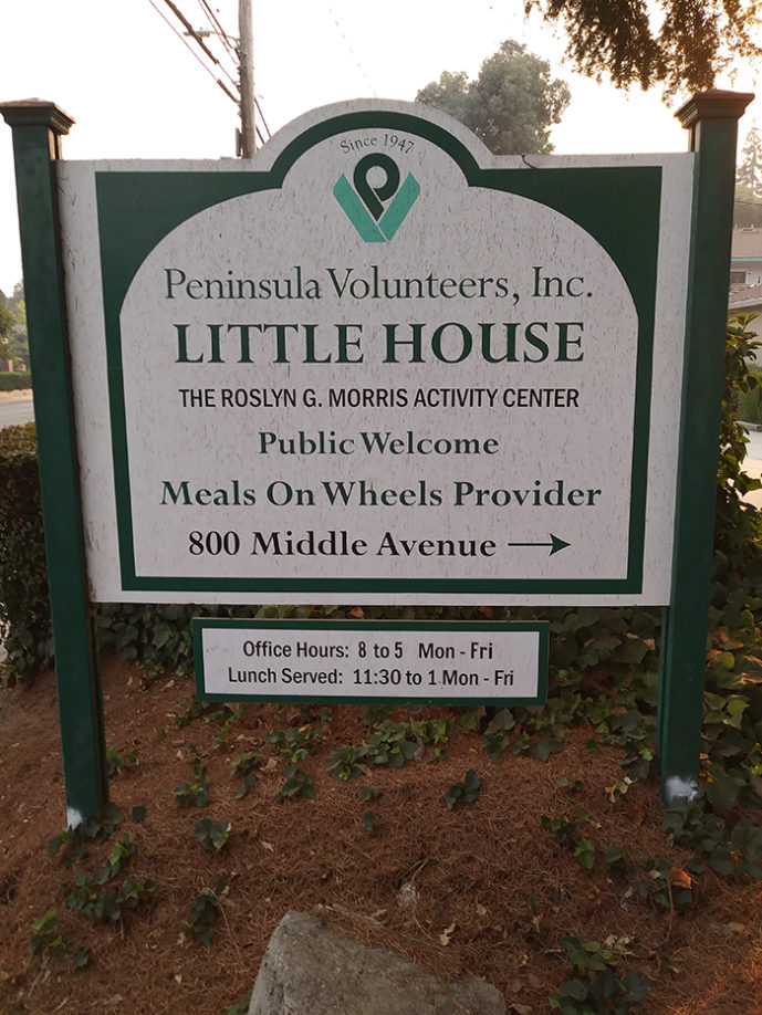 If this is your first time visiting Little House, we have some suggestions! Little House is set back quite a way from Middle Ave. If you are coming from El Camino Real and turn on to Middle (where there’s a giant Safeway), you’ll pass Nealon Park on the right. Beyond Nealon Park is a small green/white sign that says “Little House” and “Meals on Wheels.” Turn right there. (If you get to University Dr., you’ve gone too far.)