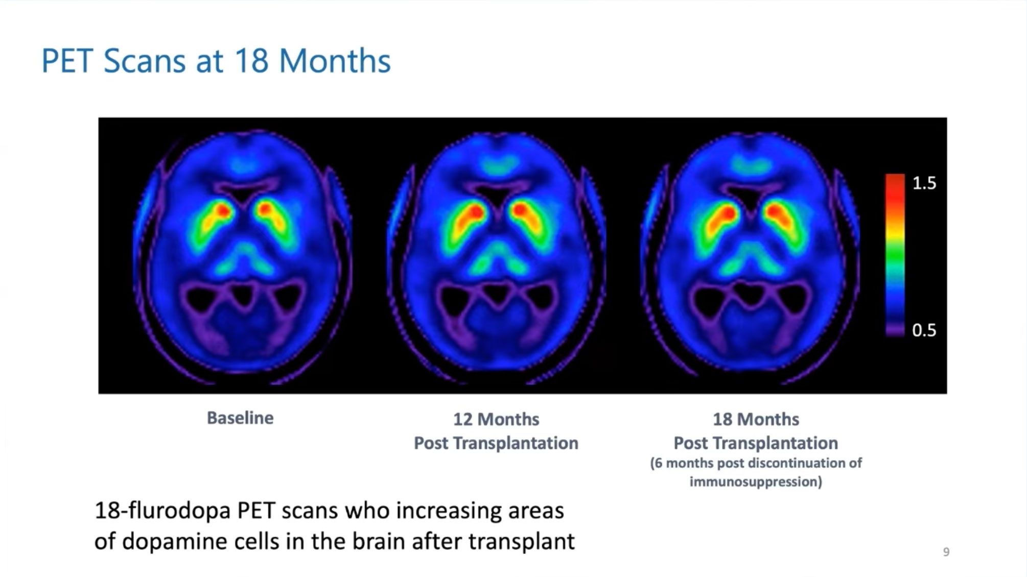The cells weren’t immunologically matched, so patients received immunosuppression drugs. Follow-up is now over three years with continued safety. PET scans showed encouraging results: at 12 months post-transplant, dopamine cells were filling in, and they continued to fill in at 18 months, even after immunosuppression stopped at 12 months.