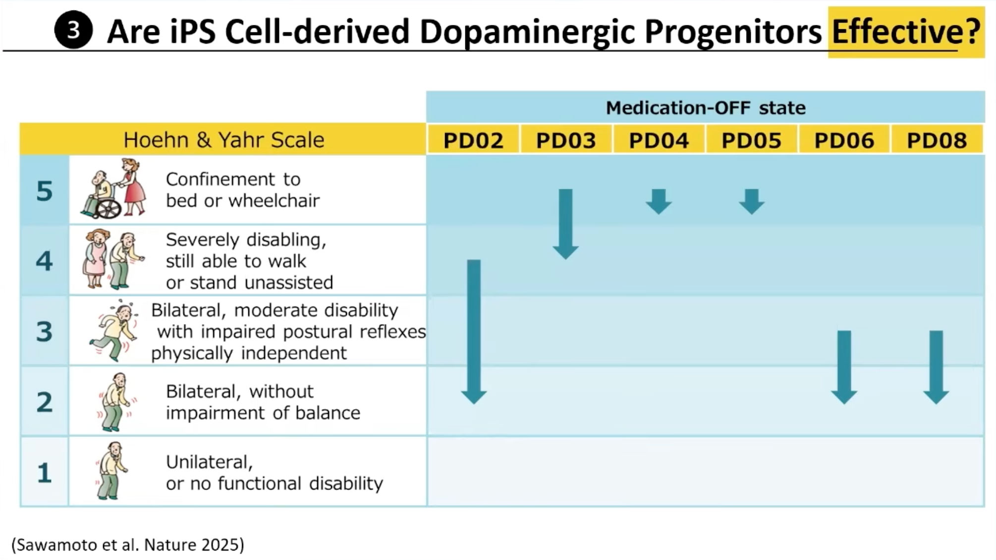 Motor function improvements varied among the seven patients. Dr. Takahashi showed results using the Hoehn and Yahr scale when patients were off medication. Four patients improved one or two stages after two years, but patients four and five did not improve. He noted that patients in later stages might not be good candidates for this type of cell transplantation, though more research with larger samples is needed.